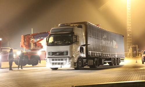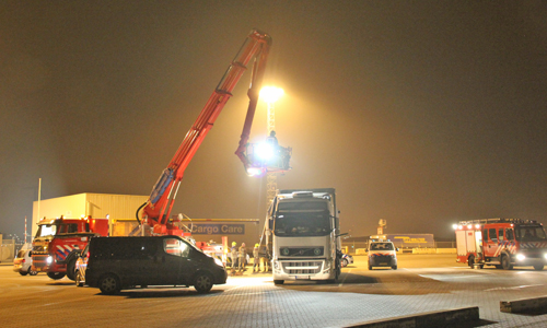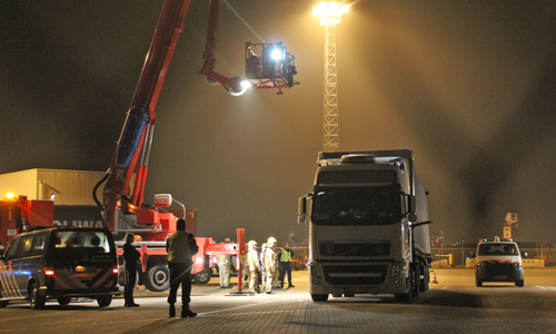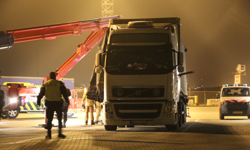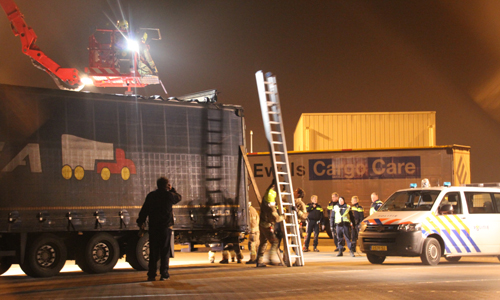 Hoek van Holland – De Koninklijke Marechaussee is donderdagavond in samenwerking met de politie en brandweer een zoektocht in een vrachtwagen gestart na het aantreffen van een vluchteling. Rond kwart voor negen werd de vluchteling aangetroffen in een Slowaakse vrachtwagencombinatie die bij de check-in voor de StenaLine richting Engeland stond. Omdat vermoed werd dat er meerdere vluchtelingen zich in de combinatie konden bevinden is de hulp ingeschakeld van de Hoekse en Maassluise brandweer. Vanuit een hoogwerker is met een speurhond van de Marechaussee gekeken of er nog meerdere mensen in de aanhanger waren. Dit bleek niet het geval. De vrachtwagenchauffeur is meegenomen door de politie. Ook de vluchteling is aangehouden.