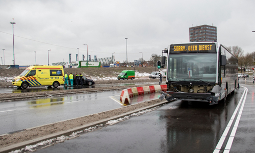 In de nieuwe situatie van verkeersknooppunt Vijfsluizen zijn in korte tijd recent na de oplevering al 2 forse aanrijdingen geweest. Afgelopen week botsten 2 auto’s op elkaar, waar de brandweer aan te pas moest komen om de inzittenden uit de auto te helpen komen. Vanmiddag was het iets verderop raak; zowel de bus als de auto raakten flink beschadigd.