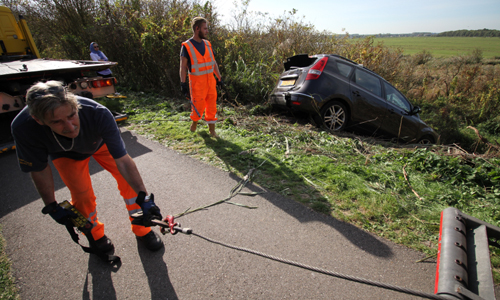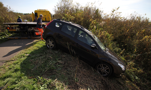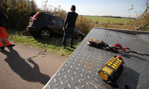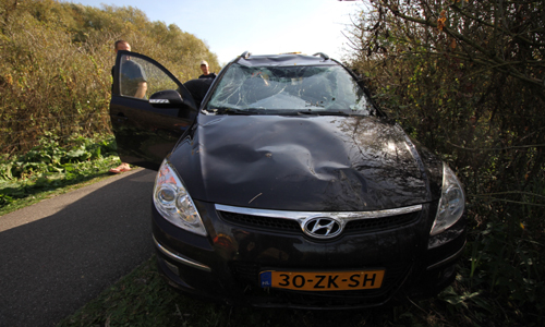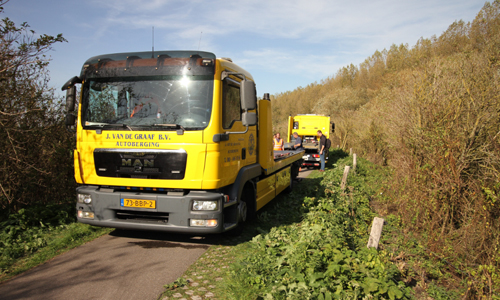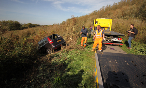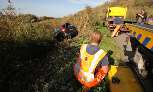 Vlaardingen – Afgelopen nacht is een automobilist op het Aalkeet-Buitenpolderpad van de dijk naar beneden gereden en op de dak tot stilstand gekomen. Het incident is pas vanmorgen om 11:30 uur bij de hulpdiensten bekend gemaakt. Bij aankomst van de politie was er geen bestuurder meer in het voertuig aanwezig. Het gebied waar de auto werd aangetroffen is alleen maar toegankelijk voor fietsers en wandelaars, daardoor was het voor de bergers moeilijker om de auto te bergen door de smalle paden. Voor de bergers een mooie en uitdagende klus die gezamenlijk volbracht werd. De eigenaar is de politie nog wel een verklaring schuldig, wat deed hij daar met de auto en waarom werd het pas uren later gemeld.