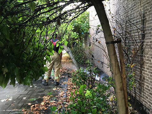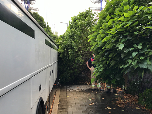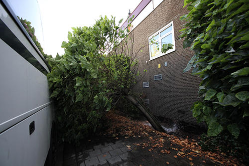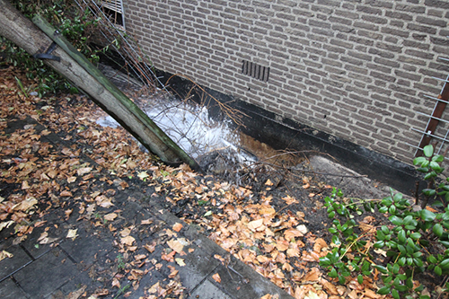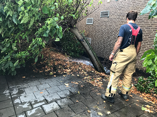 Schiedam – Dinsdagavond werd de brandweer gestuurd naar de S Gravelandseweg voor een waterlekkage op straat. Tegen de gevel van een bedrijfspand spoot het water omhoog door een breuk in de waterleiding. Een boom kwam zo los te zitten dat deze langzaam omviel tegen een geparkeerde touringkar. De brandweer moest wachten op Evides om de waterleiding af te sluiten.