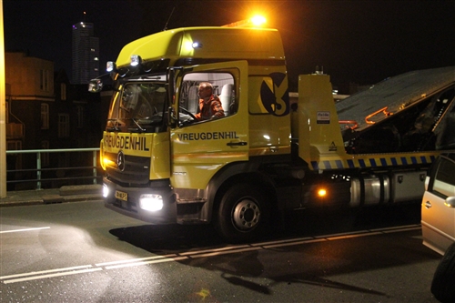 Berger Vreugdenhil kwam ter plaatse om de auto te bergen. Toen de auto op de berger stond werd het wegdek schoongemaakt. Echter bleek er olie op het wegdek te zijn gekomen, waardoor de weg na het schoonmaken nog steeds glad bleef. In afwachting van een zogeheten Soabcleaner, een vrachtwagen die het asfalt grondig kan schoonmaken, blijft het Schenkviaduct afgesloten in de richting van Voorburg.