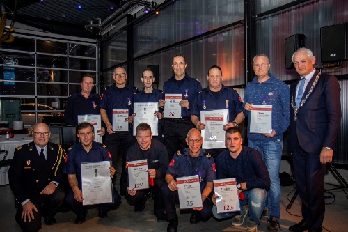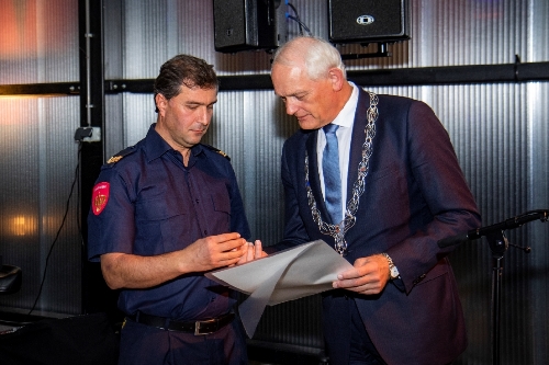 Schiedam – Donderdagavond zijn op de korpsavond van de brandweer Schiedam de jaarlijkse onderscheidingen uitgereikt voor mensen die lange tijd in dienst zijn. Alleen zat er dit jaar wel een hele bijzondere onderscheiding tussen. Na toespraken van clustercommandant Ton Muilwijk en burgemeester Cor Lamers speldde de burgemeester bij diverse brandweermannen die 10, 12½, 15, 20, 25, 30 en 35 jaar in dienst waren een lintje op. Deze lintjes worden elk jaar op de korpsavond uitgereikt als dank voor het werk en tevens als aanmoediging om het goede werk voort te blijven zetten.