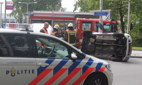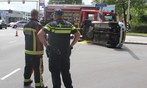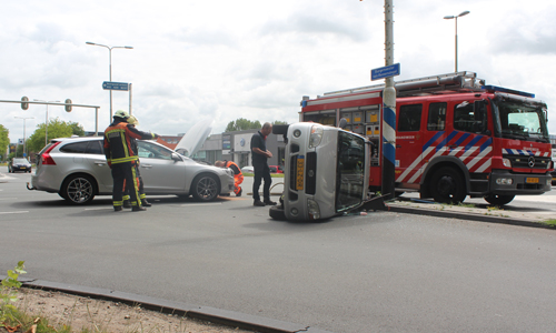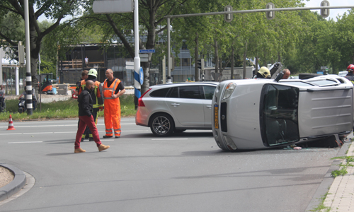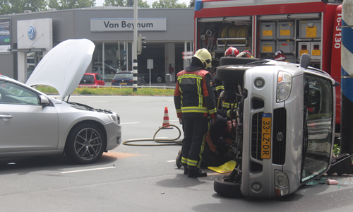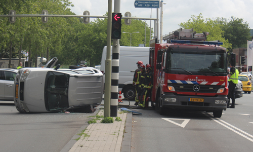 Gouda – Vrijdagmiddag vond er er op de Goudse Poort / Burgemeester van Reenensingel in Gouda een aanrijding plaats tussen twee personenauto’s. Door de klap kwam één auto op zijn zijkant terecht. Meerdere hulpdiensten waaronder de brandweer werden opgeroepen omdat de inzittende van de auto bekneld zou zitten, maar hier bleek bij aankomst geen sprake van. Wonder boven wonder raakte er niemand gewond. De kruising is enige tijd afgesloten geweest totdat de berger beide voertuigen had weggesleept.