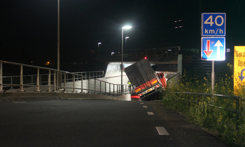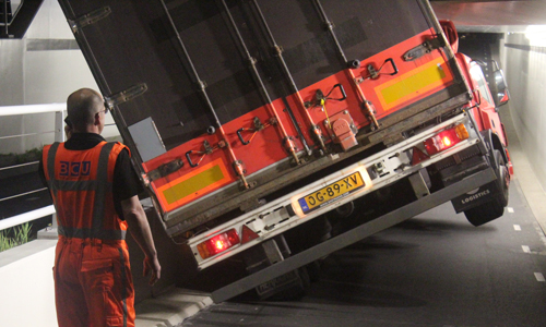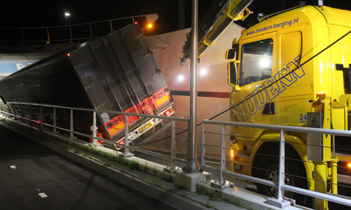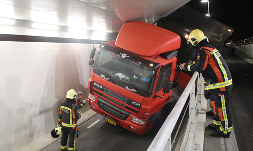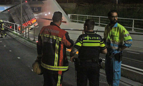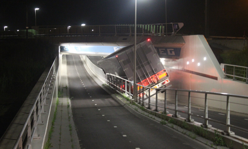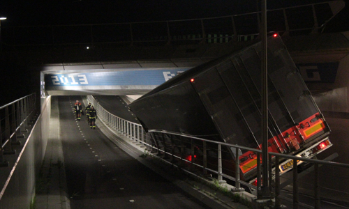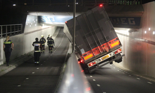 Waddinxveen – Een vrachtwagenchauffeur heeft zich in de nacht van 15 op 16 juni vastgereden op de Bredeweg -N456 in Waddinxveen. De man is drie waarschuwingspalen voorbij gereden waarna hij met zijn combinatie tegen een viaduct botste. Door de klap dreigde de vrachtwagen te kantelen, maar een naastgelegen fietspad voorkwam dit. De brandweer is met spoed ter plaatse gekomen en heeft metingen verricht om te achterhalen of er gevaarlijke stoffen zijn vrijgekomen. Dit bleek niet het geval. De bestuurder van de combinatie is nagekeken door ambulancepersoneel, maar hoefde uiteindelijk niet mee naar het ziekenhuis. Voor de vrachtwagen is een zware bergingsoperatie opgestart. Prorail is ter plaatse gekomen en heeft het viaduct gecontroleerd, om er zeker van te zijn dat de treinen vandaag kunnen rijden.