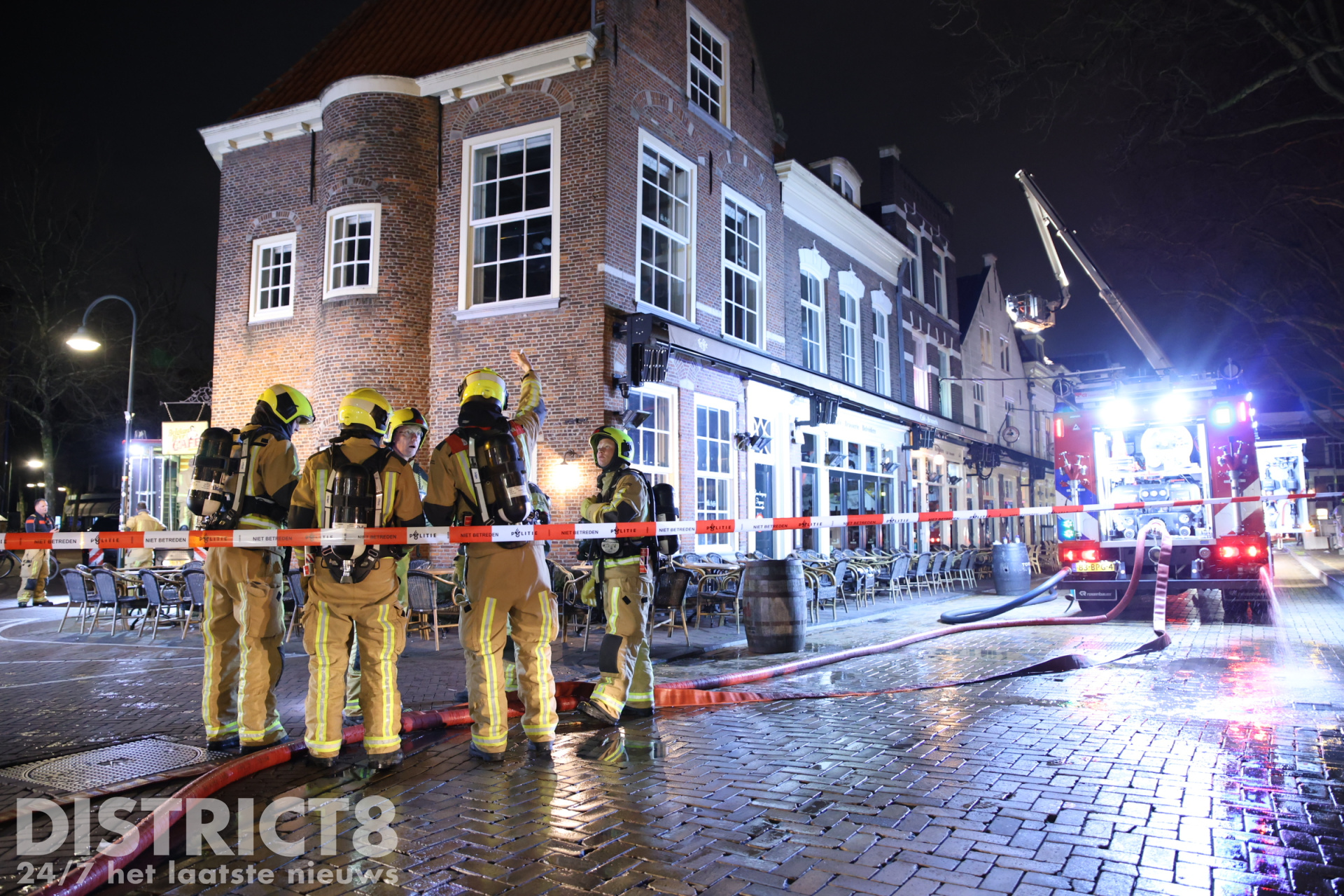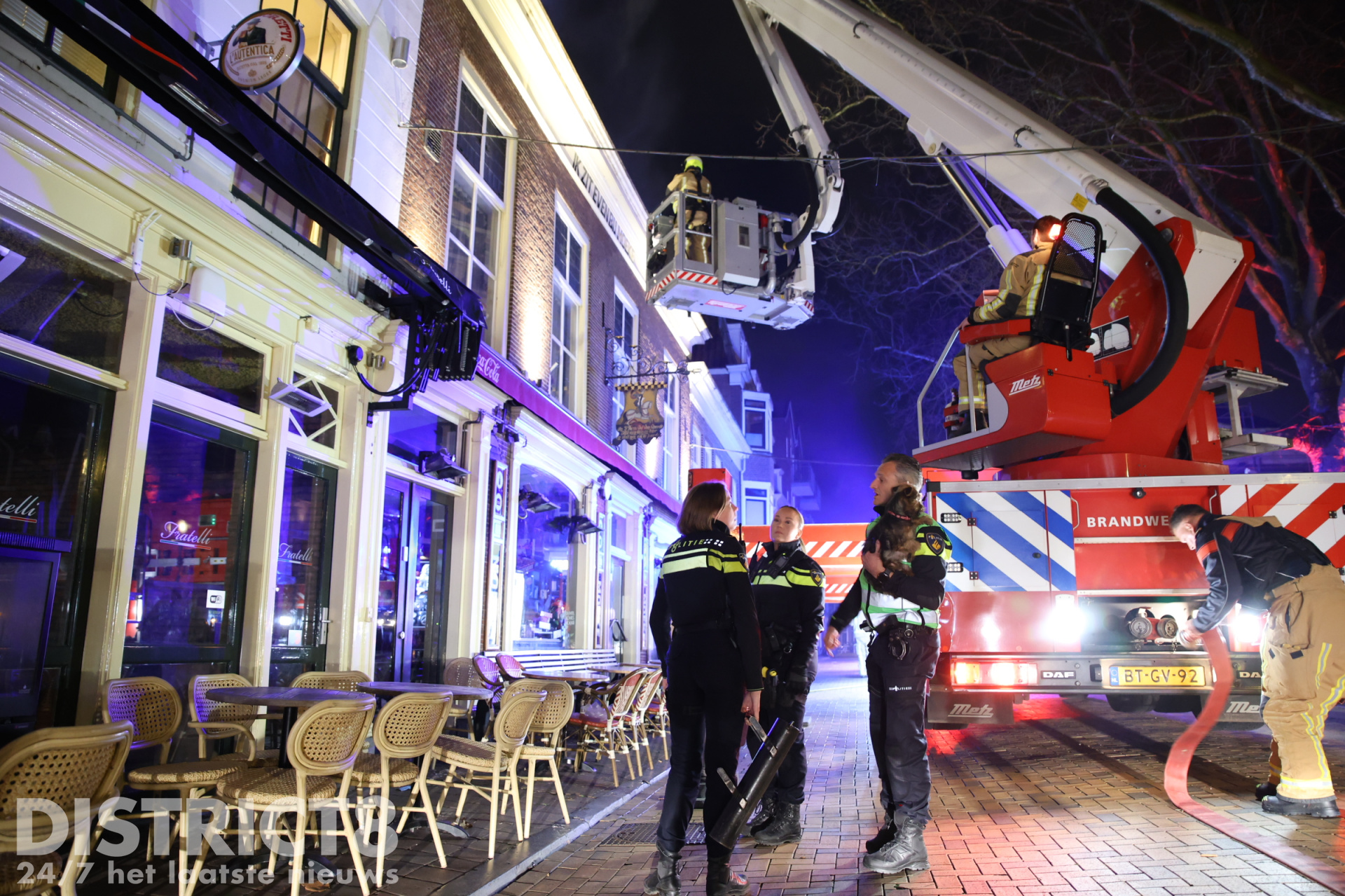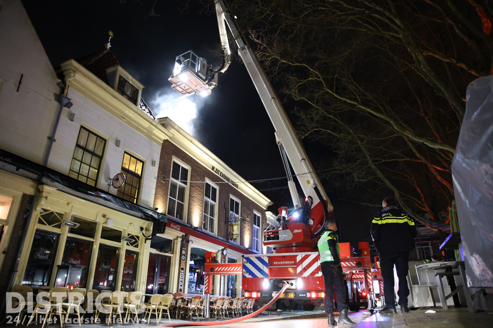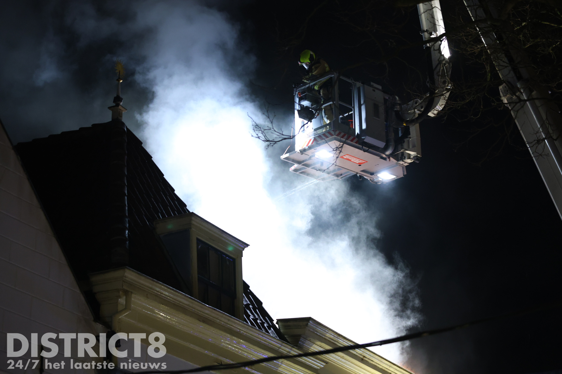 Een hoogwerker werd ingezet om de brand van bovenaf te bestrijden en sloopwerkzaamheden uit te voeren.