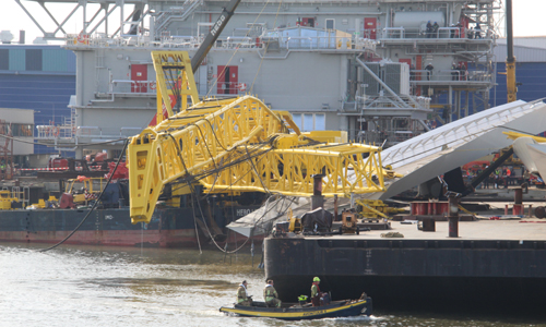 Het ongeval gebeurde tijdens het inhijsen van een brugdeel met hijskranen. Tijdens het tillen van dit brugdeel begaf een van de kranen het waardoor de combinatie omviel.