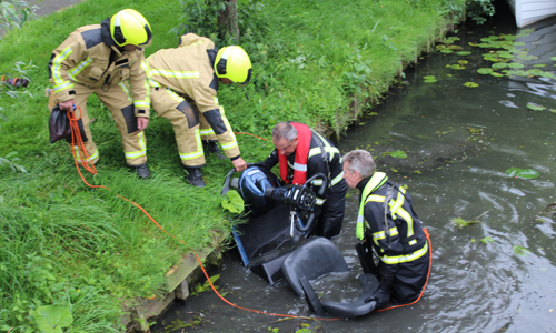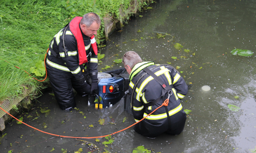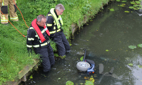 Naaldwijk – Donderdagochtend 17 augustus werden de hulpdiensten gealarmeerd voor een melding ‘persoon te water’ aan de Gerbrandystraat in Naaldwijk. Ter plaatse lag een een scootmobiel in het water. Twee brandweermannen van de kazerne Honselersdijk zijn in hun waadpak te water gegaan om de scootmobiel op de kant te krijgen. De scootmobiel bleek eerder te zijn weggenomen. De eigenaar is op de hoogte gebracht en komt de scootmobiel ophalen. De duikers van kazerne Delft bleken uiteindelijk niet nodig.