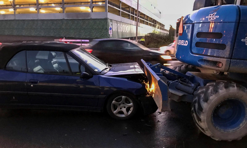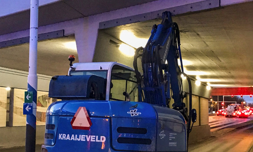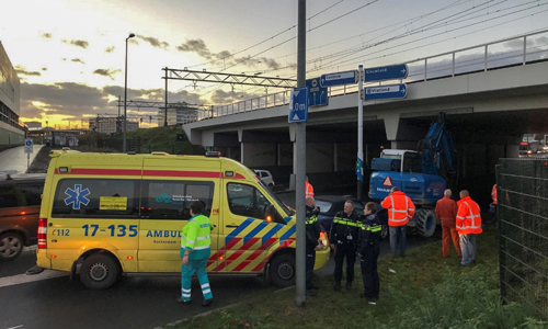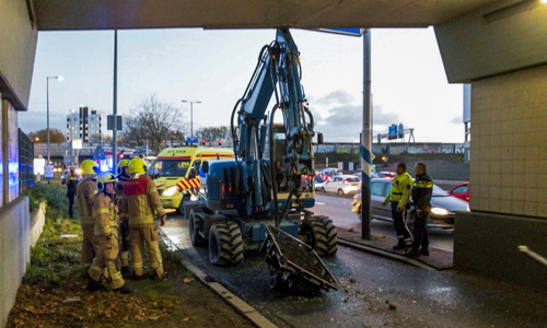 Schiedam – Op de ‘S-Gravelandseweg in Schiedam is vrijdagochtend een graafmachine tegen de bovenkant van het viaduct gebotst. Een achteropkomende auto kon niet meer op tijd remmen en botste tegen de graafmachine aan.