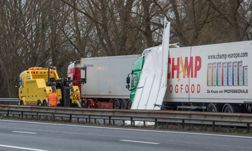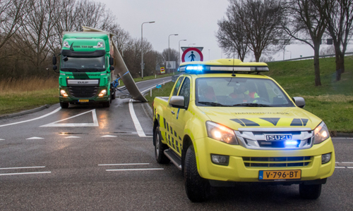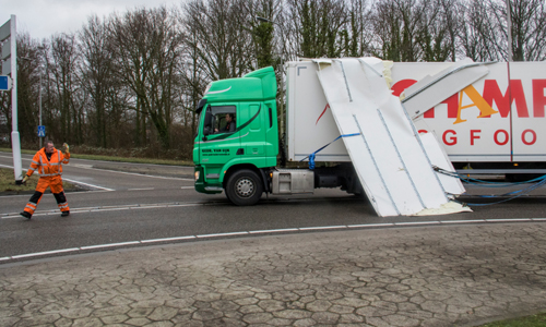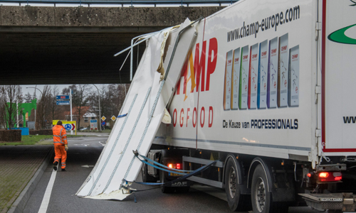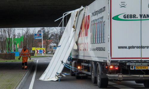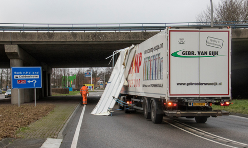 Maassluis – Op de A20 tussen Maassluis en Vlaardingen heeft een vrachtwagen zijn dak verloren door de harde wind. De snelweg werd urenlang afgesloten. Nadat het dak met spanbanden aan de vrachtwagen was vastgemaakt werd deze naar een parkeerplaats gereden om het probleem verder op te lossen.