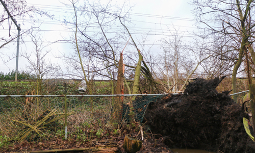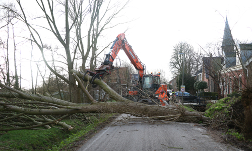 Schiedam – Op de Kerkweg in Schiedam viel ook een grote boom om. Na aankomst van de politie, en onze fotograaf, vielen er een stukje terug nog 2 bomen om. Zowel de politie als onze fotograaf moesten wachten tot de medewerkers van de gemeente ter plaatse waren om de route weer vrij te maken omdat zij precies tussen de bomen terecht waren gekomen.