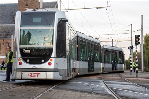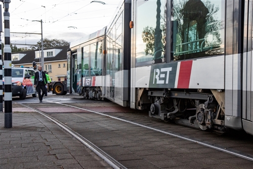 Rotterdam – Op het Breeplein in Rotterdam-Zuid is donderdagochtend een tram ontspoord op het kruispunt. Het voorste deel van de tram bleef in het spoor staan, terwijl het achterste deel op het spoor voor de tegengestelde richting terecht kwam. Het middelste gedeelte kwam op het asfalt te staan, tussen beide sporen in. De tram blokkeerde het drukke kruispunt gedeeltelijk. Politie en Handhaving regelden het verkeer en leidden de voertuigen om de tram heen. De firma De Gier kwam ter plaatse met 2 grote kranen om de tram weer in het spoor te tillen.