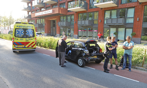 Delft – Dinsdagavond 18 september heeft er op de Martinus Nijhofflaan een aanrijding plaatsgevonden tussen twee auto’s. Het voorste voertuig moest op de rem voor een overstekende fietser, het achteropkomende busje zag dit te laat en knalde achterop. Omdat de kofferbak van de voorste auto van glas was lag een groot deel bezaaid met glas. Eén persoon is ter controle overgebracht naar het ziekenhuis. Een berger is onderweg voor beide voertuigen.