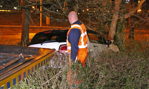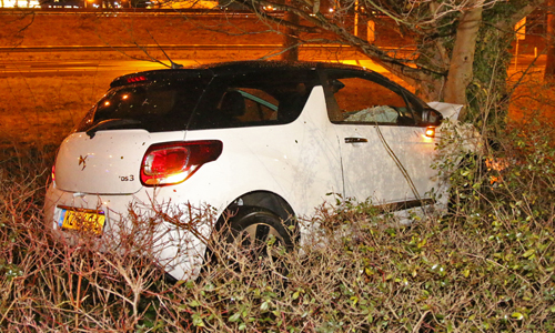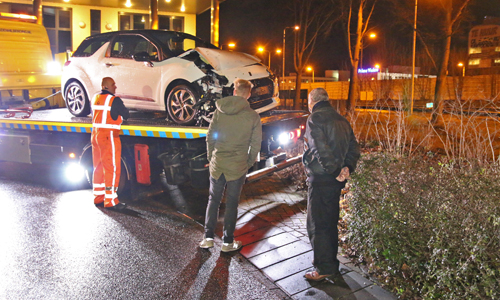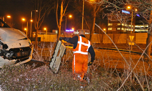 Delft – Maandagavond 2 januari is er op de Staalweg in Delft een auto uit de bocht gevlogen. De bestuurder raakte in de bocht de macht over het stuur kwijt. De auto schoot door de bosjes en belandde tegen een boom. De bestuurder en de bijrijder konden zelfstandig uit de auto komen. De politie en de ambulancedienst kwamen ter plaatse, de bestuurder is in de ambulance nagekeken. Berger Vreugdenhil heeft de zwaar beschadigde auto uit de bosjes getrokken. De auto is door de klap total-loss. Er raakte niemand gewond bij de aanrijding.