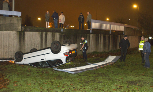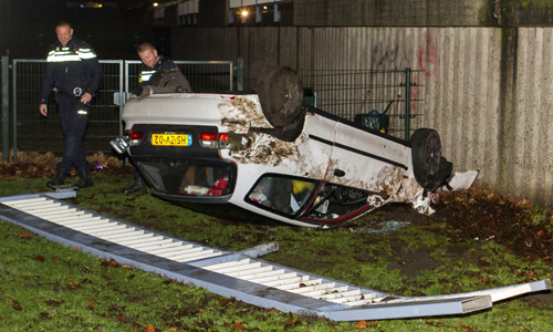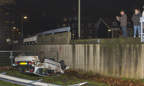 Schiedam – Woensdagavond is er op de Havendijk een auto door een balustrade gereden en op zijn dak tot stilstand gekomen op het lager gelegen grasveld. De bestuurder raakte hierbij gewond en is per ambulance overgebracht naar het ziekenhuis. De Havendijk verloopt daar in een flauwe bocht waar de bestuurder mogelijk de macht over het stuur is kwijtgeraakt. De auto reed de stoep op, reed dwars door de balustrade heen en viel twee en halve meter naar beneden. Een berger heeft de auto later weggetakeld.