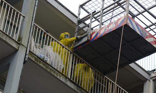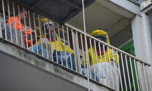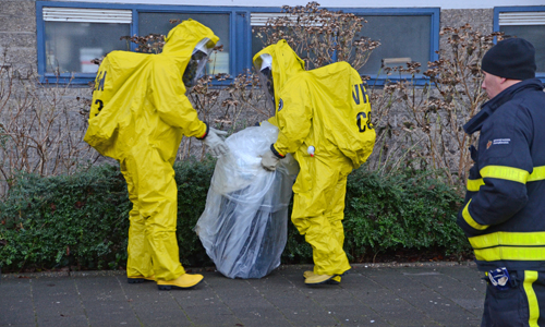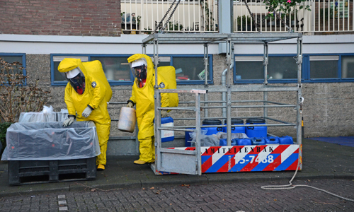 Leidschendam – Donderdagochtend is de politie samen met de LFO (Landelijke Faciliteit Ontmantelen) en de FO (Forensische Opsporing) begonnen met het ontruimen van de woning. De LFO heeft eerst alles goed in beeld gebracht, later is de hulp van de GSE (gevaarlijke stoffen eenheid) van de Haagse kazerne ‘Laak’ ter plaatse gevraagd. Samen met de Grote Kraan van kazerne ‘Leidschenveen’ zijn alle vaten naar beneden gehaald. Deze zijn meegenomen door een gespecialiseerd bedrijf die de vaten gaat vernietigen.