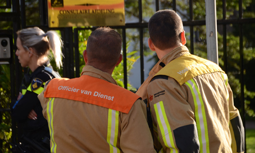 Korte tijd later werd de verwarde man op een brandcard de ambassade uit gehaald. Hij werd voor onderzoek overgebracht naar het ziekenhuis.