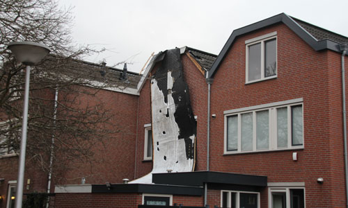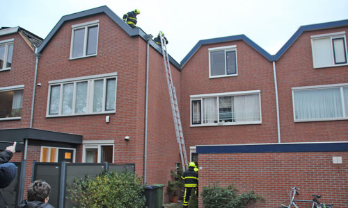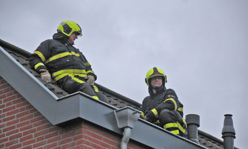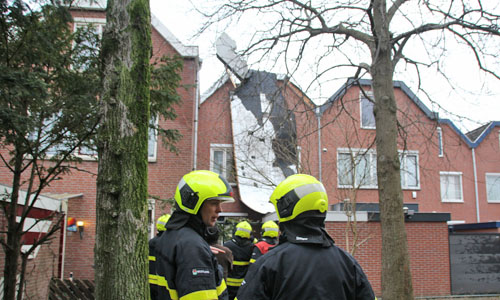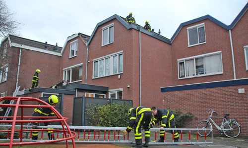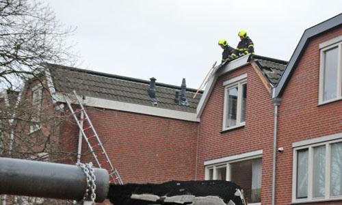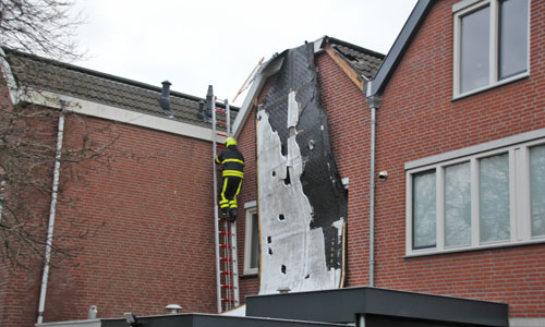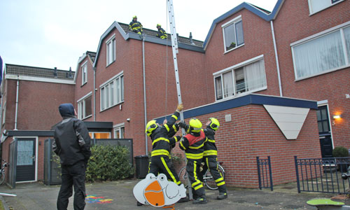 Monster – De brandweer is donderdagmiddag 23 februari gealarmeerd voor een stormschade aan de Klinkenberg in Monster. Een dakbedekking was door de wind van het dak gewaaid en hing langs de woning. Twee brandweermannen zijn het dak op gegaan om vervolgens de bedekking los te maken. Toen dit eenmaal zo ver was viel echter ook de ladder waarmee zij naar boven waren gekomen om. De ladder viel op een schutting en kon niet direct gebruikt worden. Na wat handigheidjes kon de ladder weer gebruikt worden en zodoende de brandweermannen van het dak gehaald worden.