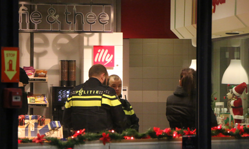De politie zoekt een man met een fors postuur. Hij had een zwarte muts op zijn hoofd en een zwarte sjaal voor zijn mond en droeg een zwarte plastic tas bij zich.