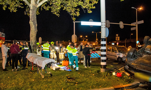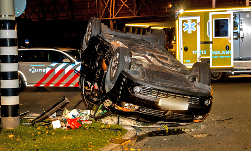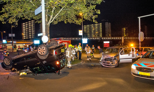 Schiedam – Bij een aanrijding op de ‘s-Gravelandseweg is donderdagavond een auto op zijn dak tot stilstand gekomen. Twee auto’s raakte zwaarbeschadigd, een persoon raakte gewond en is per ambulance overgebracht naar het ziekenhuis. Het ongeval gebeurde bij de afrit van de A20, de afrit werd afgesloten tijdens de afhandeling van het ongeval. Beide voertuigen moesten door een bergingsbedrijf opgehaald worden.