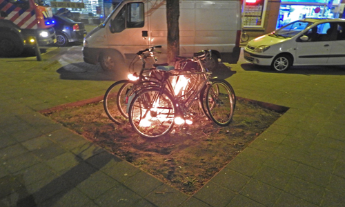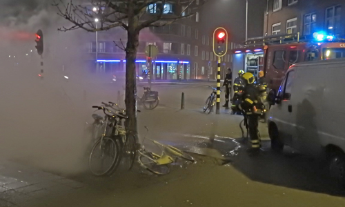 Den Haag – Niet veel later kwam er opnieuw een melding binnen op de meldkamer van een voertuigbrand aan de Kempstraat in Den Haag. Nog geen 10 meter van het andere busje stonden 5 á 6 fietsen in de brand die tegen een boom aan stonden. De brandweer heeft de brandende fietsen geblust. Ook hier gaat de politie uit van brandstichting.