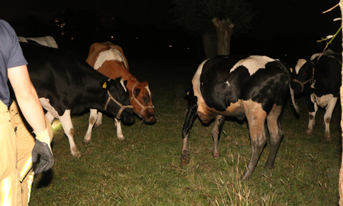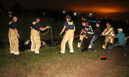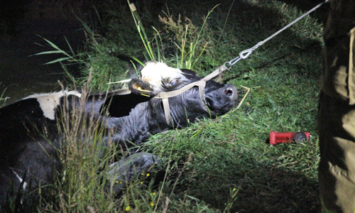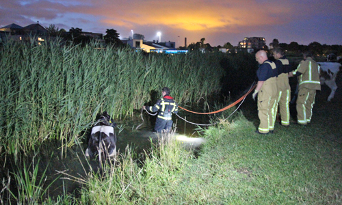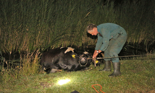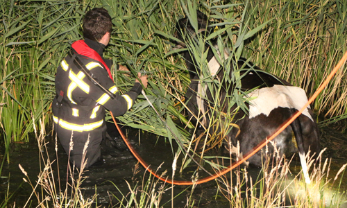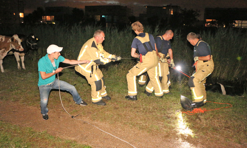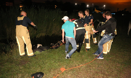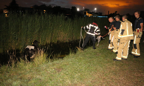 Delft – Woensdagavond 28 juni is een koe te water geraakt langs het Derde Wereldpad in Delft. De brandweer werd om kwart voor elf gebeld door een passant die de koe in het water zag staan. De brandweer is ter plaatse gekomen en kon na geruime tijd in samenwerking met de boer, omwonenden en een van onze fotografen de koe uit het water halen. De koe is overgedragen aan de boer.