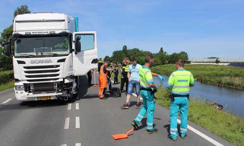 Door de klap raakte de bestuurder van de personenauto de macht over het stuur kwijt en kwam onderaan de dijk terecht in het water. Ter plaatse bleek de bestuurder al zelfstandig uit de auto te zijn gekomen. De ambulancedienst heeft enkele personen gecontroleerd, niemand is vervoerd. De N220 was tijdens het incident afgesloten voor al het verkeerd. Berger Vreugdenhil heeft de auto uit het water gehaald.