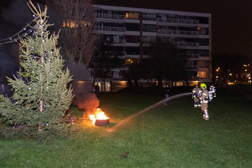Vlaardingen – In de nacht van vrijdag op zaterdag heeft de brandweer een brandende band en kerstboom geblust aan de Mr. L.A. Kesperweg. Onderaan de dijk vlak naast de woningen was de brand ontstaan. Met een straal water werd het vuur gedoofd, nadat een bewoner al was begonnen met een emmer water. Na een paar minuten kon de brandweer weer vertrekken.