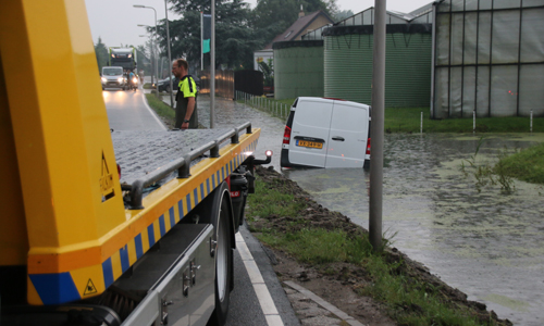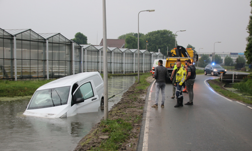 De Lier – Op de Hoefweg in De Lier is vanavond een bestelbusje te water geraakt nadat de bestuurder moest uitwijken voor een tegemoet komende vrachtwagen. Gelukkig raakte niemand gewond. De berger kwam ter plaatse maar in verband met het onweer kon de berger niet te water met zijn waadpak om de auto vast te maken aan de kraan.