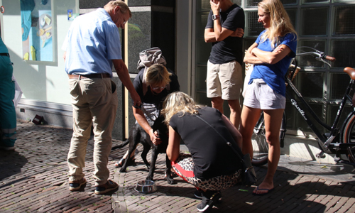 Terwijl de hulpdiensten druk bezig waren met de amokmaker ontfermden omstanders zich om de hond van het baasje. Nadat de man in de ambulance lag nam de politie de zorg over de trouwe viervoeter over. De politie heeft de hond uiteindelijk meegenomen en zal het beestje later terug geven aan de eigenaar. Waarom de man aggesief werd is niet bekend.