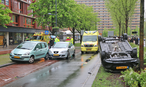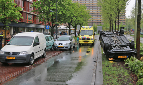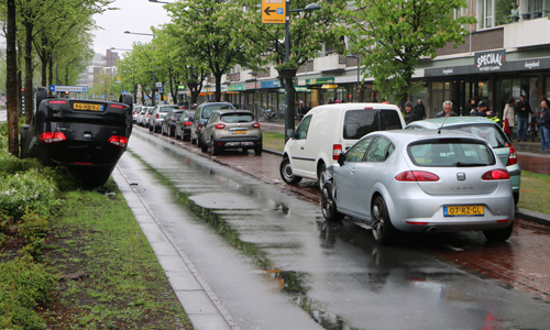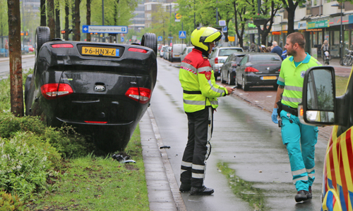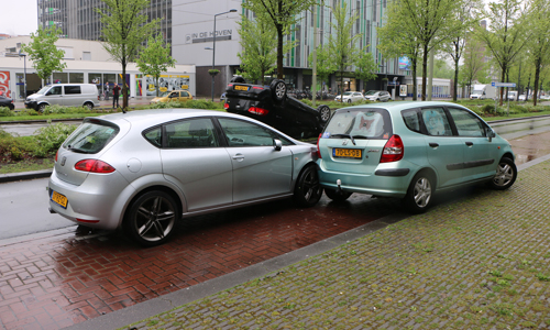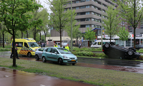 Delft – Maandagochtend 30 mei werden de hulpdiensten groots gealarmeerd voor een ongeval op de Papsouwselaan in Delft. Ter plaatse bleek er een auto op de kop te zijn beland na een ongeval met een ander voertuig dat het parkeervak verliet. De brandweer die gealarmeerd was voor mogelijke beknelling was niet noodzakelijk. De ambulancedienst heeft 2 inzittende uit de zwarte auto gecontroleerd, deze inzittende kwamen zelfstandig uit het voertuig. De Papsouwselaan was door het afgesloten voor al het verkeer.