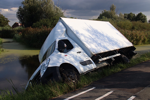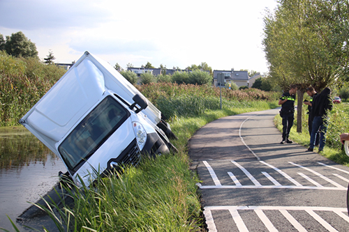 Vlaardingen / Schiedam – Op de Woudweg is vrijdagmiddag een kleine vrachtwagen bijna te water geraakt na een uitwijk manoeuvre voor een wielrenner. De wagen zakt weg in de berm en bleef wonder boven wonder hangen boven het water. Het is er ter plaatse erg smal, de bestuurder ging opzij voor een wielrenner en zakte weg. Het weer op de kant krijgen wordt nog een lastig verhaal, een takelwagen kan er niet naast staan dus een kraanwagen zal ter plaatse moeten kijken of er ruimte genoeg is om de kraan op te zetten. Hierna kan de berging beginnen.