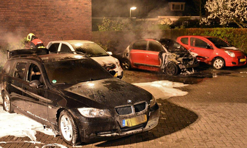 Nootdorp – Op de Neogotiekgof in Nootdorp zijn in de nacht van maandag op dinsdag vier auto’s in brand gevlogen. Door omwonende werd als snel de brandweer gebeld. Omdat het om meerdere brandhaarden ging en omdat de auto’s vlakbij een woning stonden schaalde de brandweer al snel op naar ‘Middelbrand’. Door snel ingrijpen van de brandweer was het vuur snel geblust. De politie stelt een onderzoek in naar de brand, maar brandstichting is zeer waarschijnlijk de oorzaak.