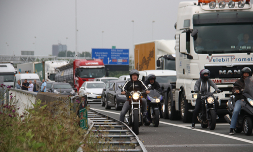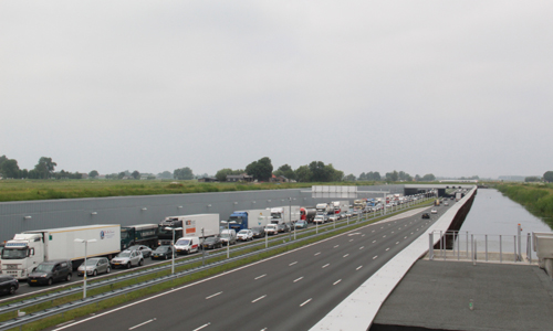 Stilstaand verkeer in de file wordt weggeleid van de A4. Het verkeer staat al muurvast vanaf Delft, omdat er gedoseerd wordt in de Ketheltunnel.
