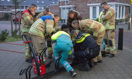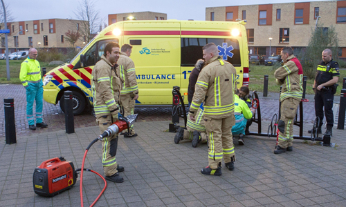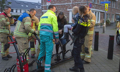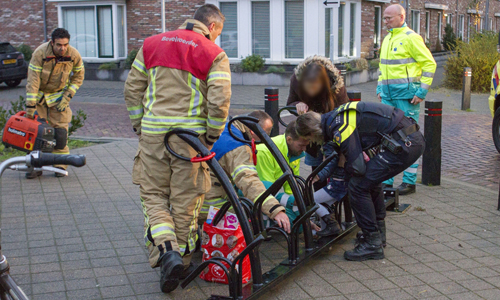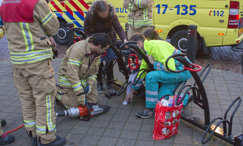 Vlaardingen – De hulpdiensten rukten zaterdagmiddag met spoed uit naar de Fannius Scholtenstraat alwaar een meisje met haar been in een fietsenrek vast was komen te zitten. Er is nog getracht voorzichtig het meisje los te trekken maar ze zat te vast met haar been. De brandweer heeft het meisje eerst uitgelegd wat ze gingen doen zodat het voor haar minder eng was. Met de spreider is het metaal uit elkaar gedrukt zodat haar beentje vrij kwam. Het meisje doorstond alles dapper en raakte verder niet gewond. Ze is nog wel even voor alle zekerheid in de ambulance nagekeken.