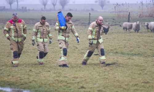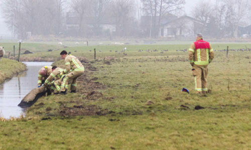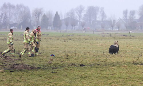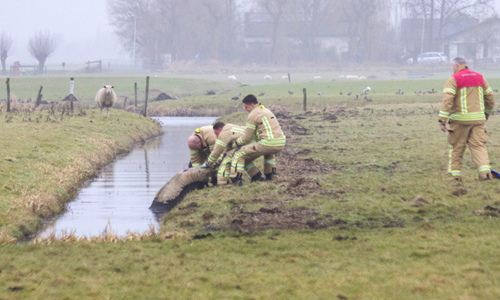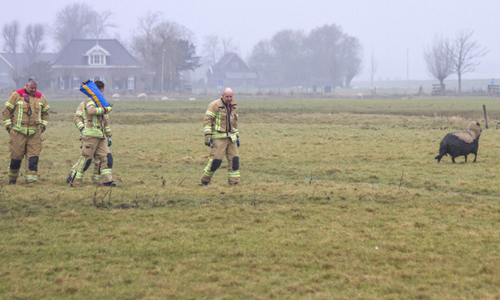 Vlaardingen / Schiedam – Zondagmorgen zag een voorbijganger een schaap in de sloot liggen nabij de Vroonweerseweg op de grens Vlaardingen – Schiedam. Omdat de vacht al veel water had opgezogen en het beest daardoor te zwaar was om zelf op het droge te komen werd de brandweer ter plaatse gestuurd. Met vereende kracht werd het schaap op het droge getrokken door de brandweermannen. Het half zwart geworden schaap kon zich daarna weer stinkend en al bij de rest van de kudde voegen.