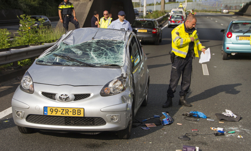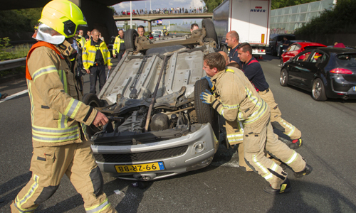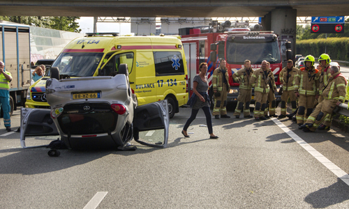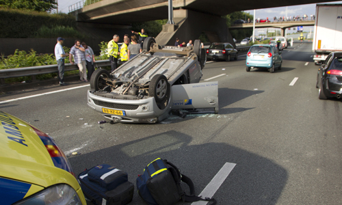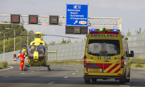 Rotterdam – Maandagavond heeft er op de A20 bij Rotterdam een ongeval plaatsgevonden tussen een vrachtwagen en een auto. De auto kwam hierbij op zijn dak terecht. De hulpdiensten rukten massaal uit omdat er mogelijk mensen in het voertuig bekneld zouden zitten. De traumahelikopter landde op de snelweg voor medische assistentie. De A20 was vanuit Schiedam volledig gestremd, verkeer kon nog wel de afrit Blijdorp nemen. Het slachtoffer is met spoed overgebracht naar het ziekenhuis. Nadat de traumahelikopter opgestegen was werd een rijstrook vrijgegeven zodat het stilstaande verkeer het ongeval kon passeren. Ter hoogte van het Kleinpolderplein reden al diverse auto’s tegen het verkeer de A20 af wat voor gevaarlijke situaties zorgde. Eerder vandaag was er exact op de punt ook al een ongeval gebeurd met 4 gewonden. Ook hier was een vrachtwagen bij betrokken.