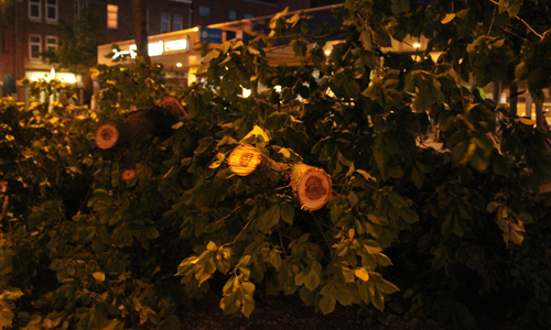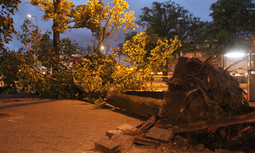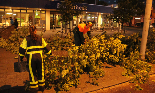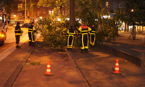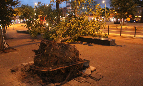 Den Haag – Dinsdagavond 6 juni waaide omstreeks 22:30 uur een flinke boom met wortel en al om aan de Hobbemaplein in Den Haag. De boom kwam op de stoep en op het fietspad tegen een bushalte neer. Dit zorgde voor overlast, waarop de brandweer heeft besloten de takken weg te zagen. Een deel van de stoep was nog begaanbaar, dus besloten ze de boom niet volledig te snoeien.