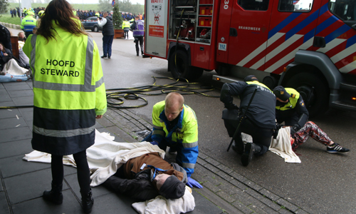 Om zich goed voor te bereiden op (grote) incidenten oefenen de hulpdiensten in de regio Haaglanden met grote regelmaat. Dit doen ze ook voor uw veiligheid. Tijdens deze grote calamiteitenoefening in het voetbalstadion van ADO Den Haag wordt de Grootschalige Geneeskundige Bijstand (GGB) geoefend. Bij een calamiteit met veel slachtoffers voorziet de GGB er in om gewonden te triëren, stabiliseren, behandelen en zo spoedig mogelijk van de incidentlocatie naar het ziekenhuis te brengen voor verdere behandeling.