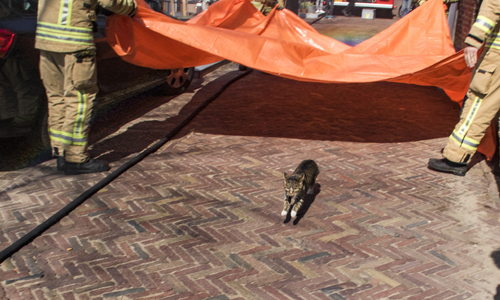 Schiedam – De brandweer Schiedam heeft zaterdagmiddag aan de Lange Haven een kat uit een boom gejaagd. De hoogwerker van de brandweer kon de locatie niet bereiken, waardoor er een andere oplossing gezocht moest worden. Door een straal water net naast de kat te spuiten werd het beestje opgejaagd om te verplaatsen. Het gewenste effect werd ook behaald; de kat rende zo naar beneden en sprong vervolgens op straat. Vier brandweermannen stonden met een zeil klaar om de kat op te vangen, mocht deze vallen of ergens anders heen springen, maar de kat had hier weinig zin in en sprong op straat en ging er volgens snel vandoor.
