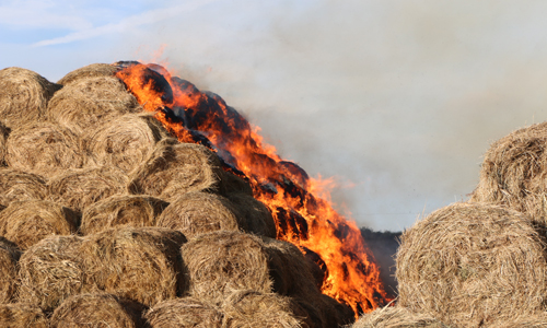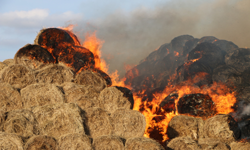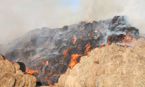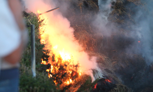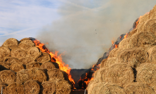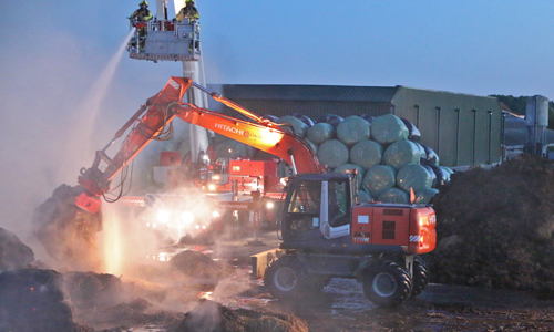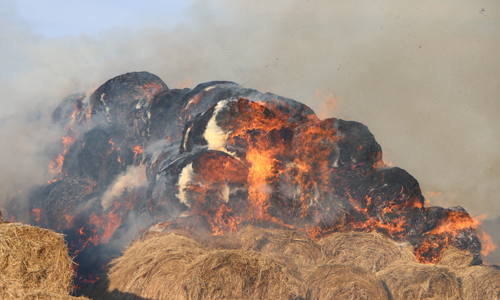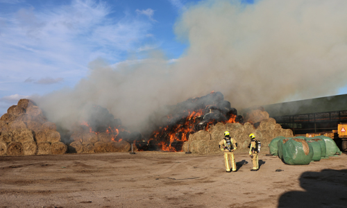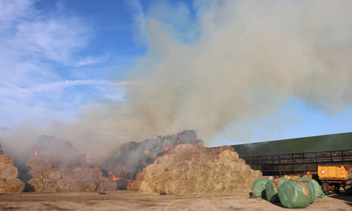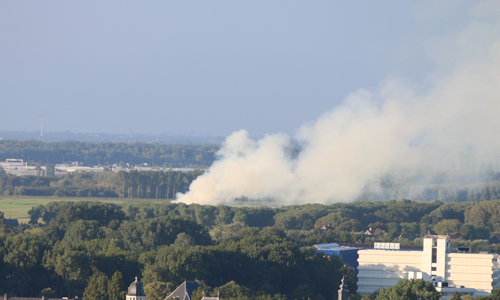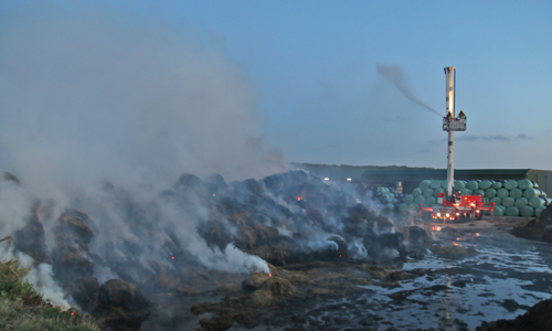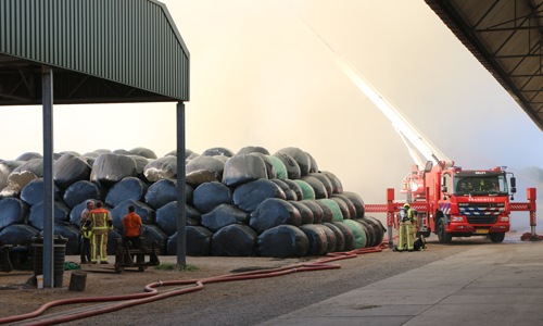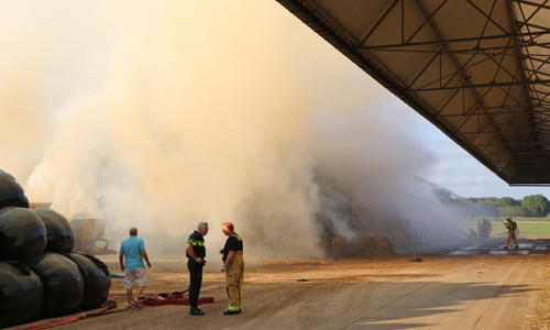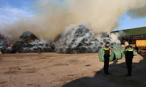 Update 21;00; Inmiddels is er een tweede hoogwerker gealarmeerd, ook een groot watertransport uit De Lier is ter plaatse gekomen. Deze bouwen waterwinning op voor de brandweer-eenheden, het water komt vanaf de grote plas in de Delftse Hout. De brandweer verwacht nog langere tijd bezig te zijn met bluswerkzaamheden, later op de avond komen shovels ter plaatse om de hooibalen uit elkaar te trekken. De rook trekt richting Rotterdam. Meetploegen zijn op pad om te meten of er nergens gevaarlijke stoffen in de lucht hangen.
