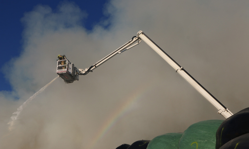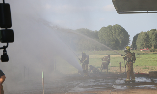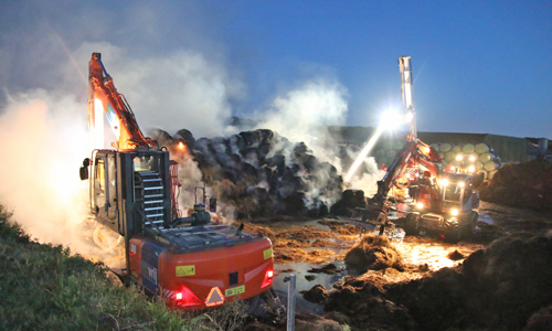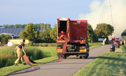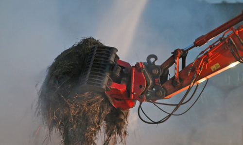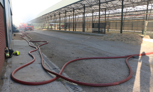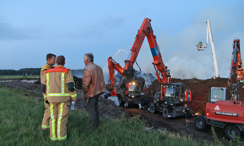 Update 22;30; Grote kranen en shovels zijn inmiddels gearriveerd bij de brandberg. De brandweer heeft 2 hoogwerkers opgesteld die de berg d.m.v. waterstralen nathouden. De kranen en shovels halen stukje voor stukje de berg uit elkaar. Tussen de berg en de stal heeft de brandweer de Fire Defender ingezet, dit is een buizen-systeem waar gaten inzitten die een soort van watermuur maken om de stal veilig te houden. De brandweer verwacht nog uren bezig te zijn met de brand. Inmiddels is de rook afgenomen maar is deze nog wel goed te zien. De brandweermannen van de kazerne Naaldwijk komen ter plaatse voor aflossing.