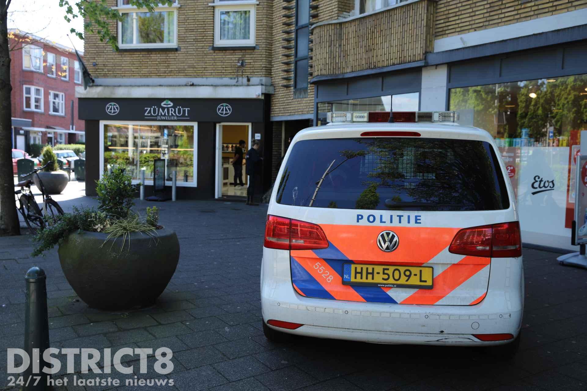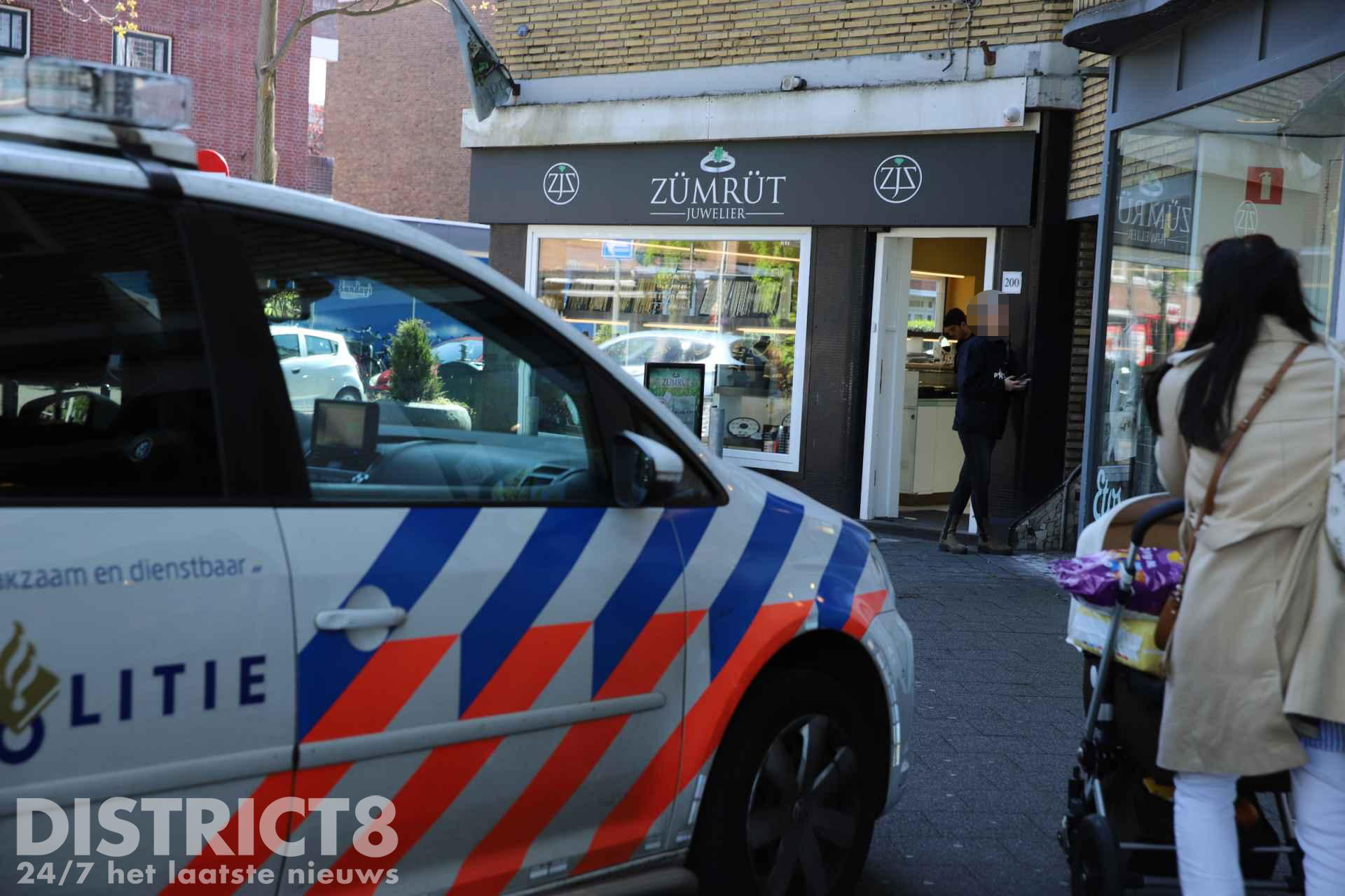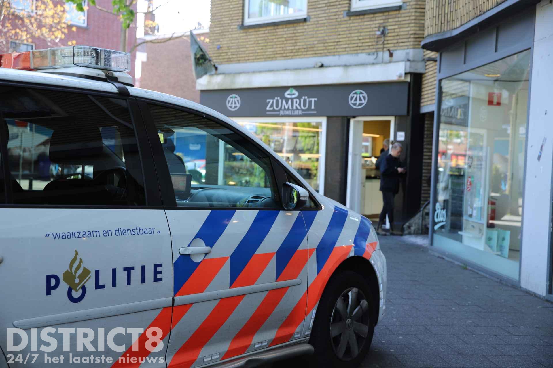 De recherche is aanwezig bij de juwelier om onderzoek te doen. Het is onbekend of er buit is gemaakt.
