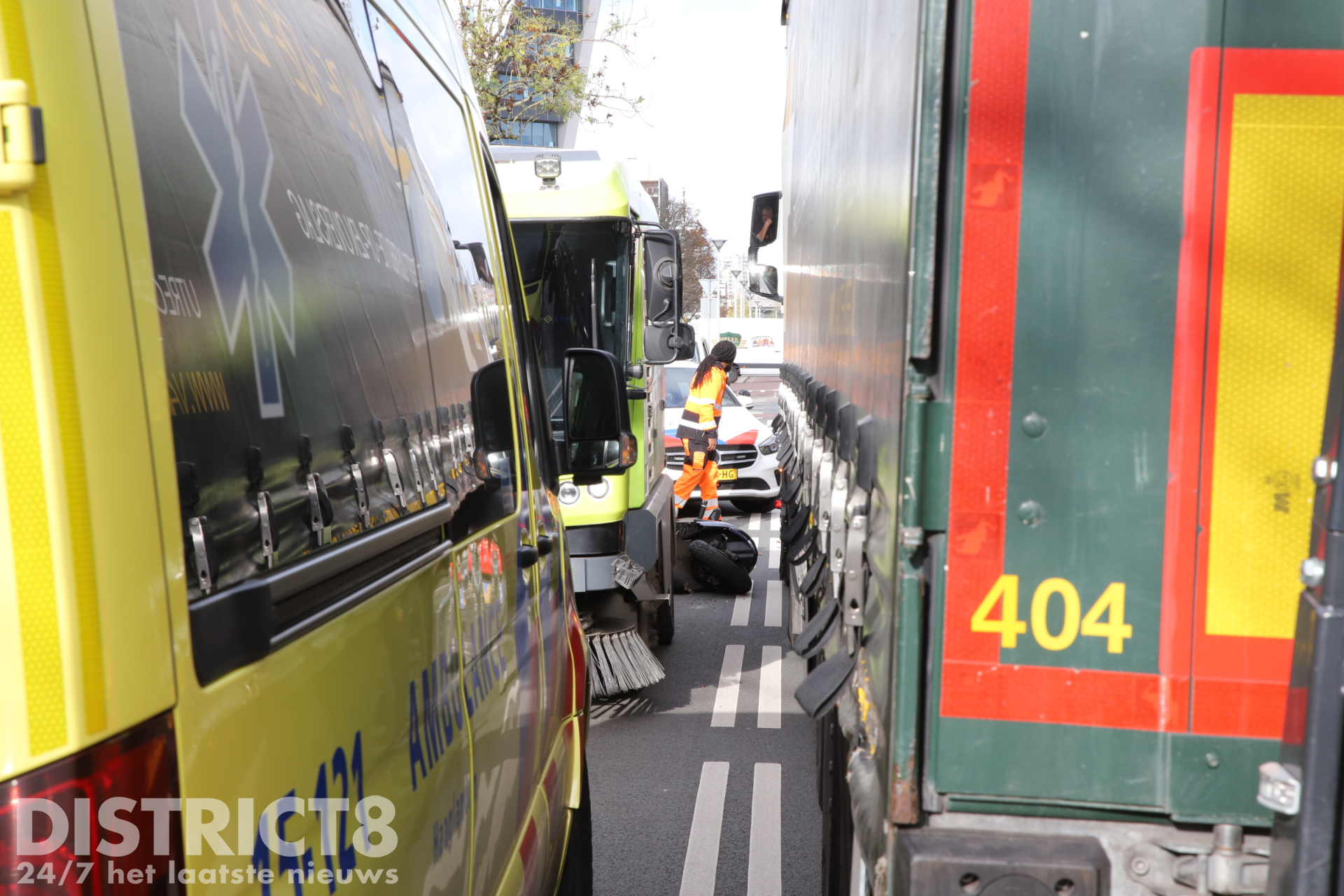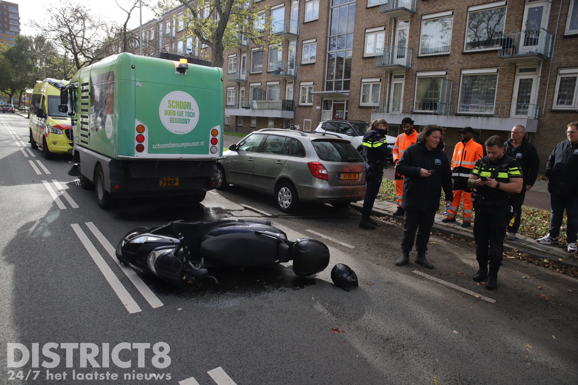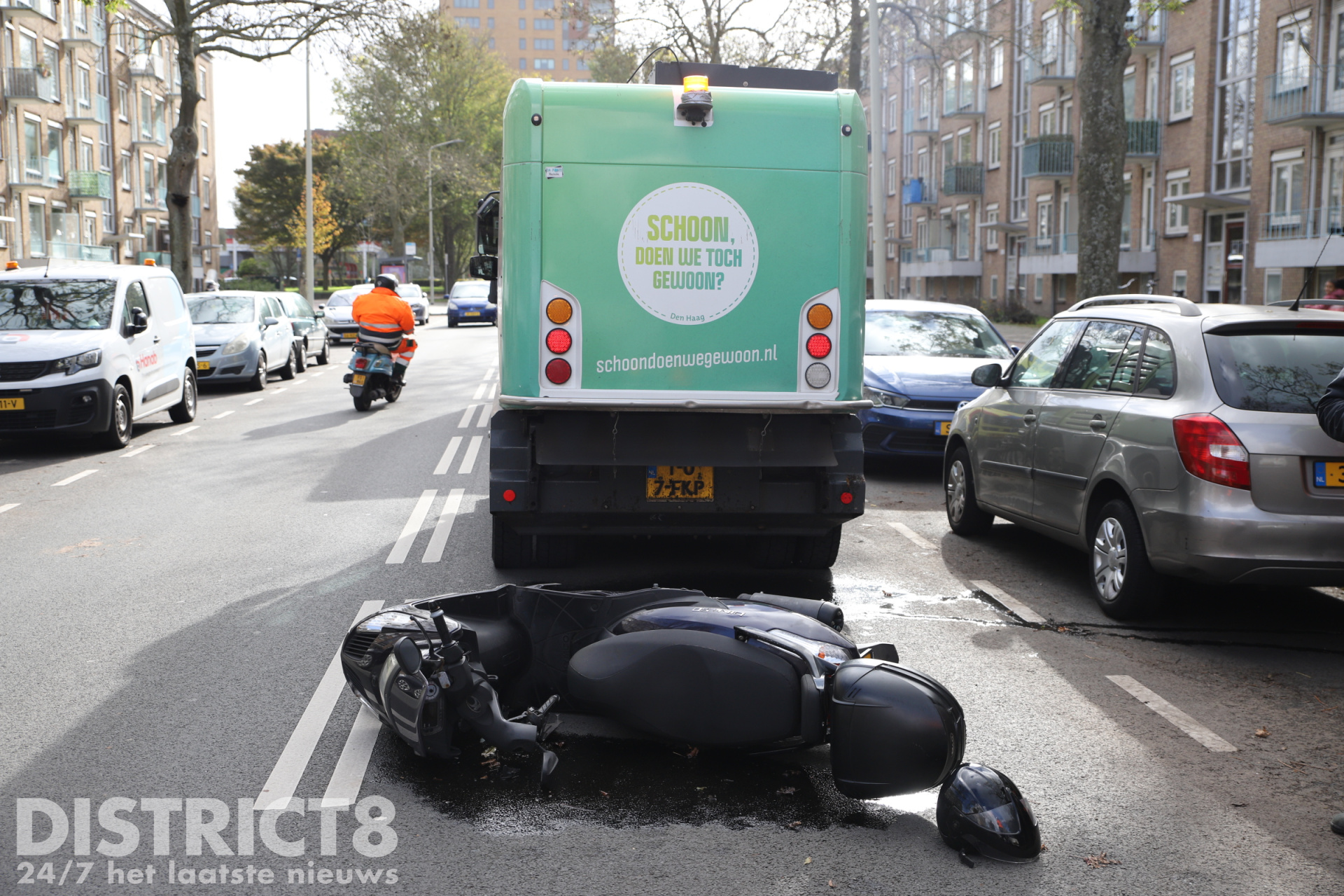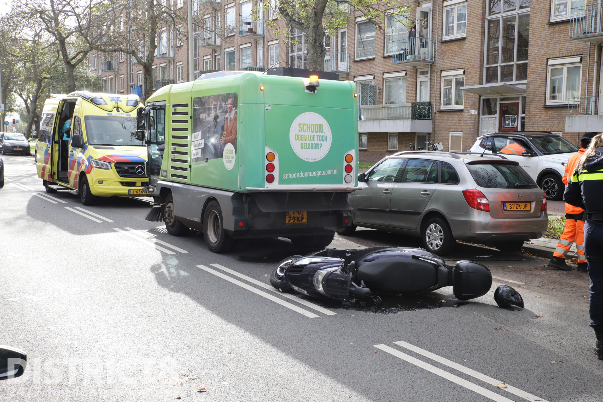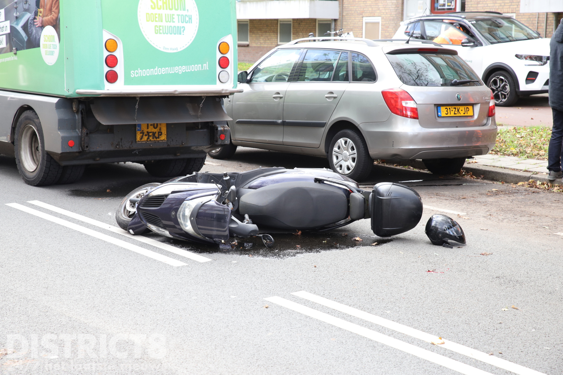 Den Haag – Op de Leyweg in Den Haag heeft vrijdagochtend een ongeval plaatsgevonden tussen een scooterrijder en een veegwagen.