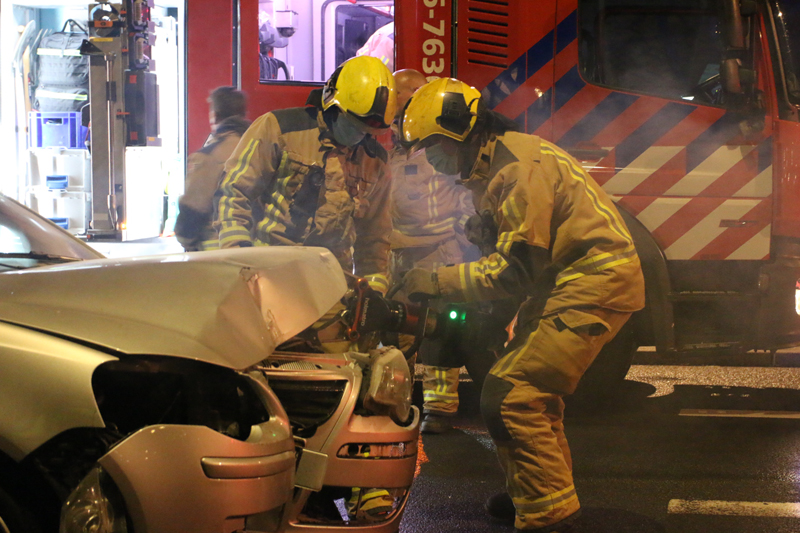 Agenten die achter het voertuig aanreden zijn direct begonnen met een eerste bluspoging, inmiddels werd ook de brandweer met spoed gealarmeerd.