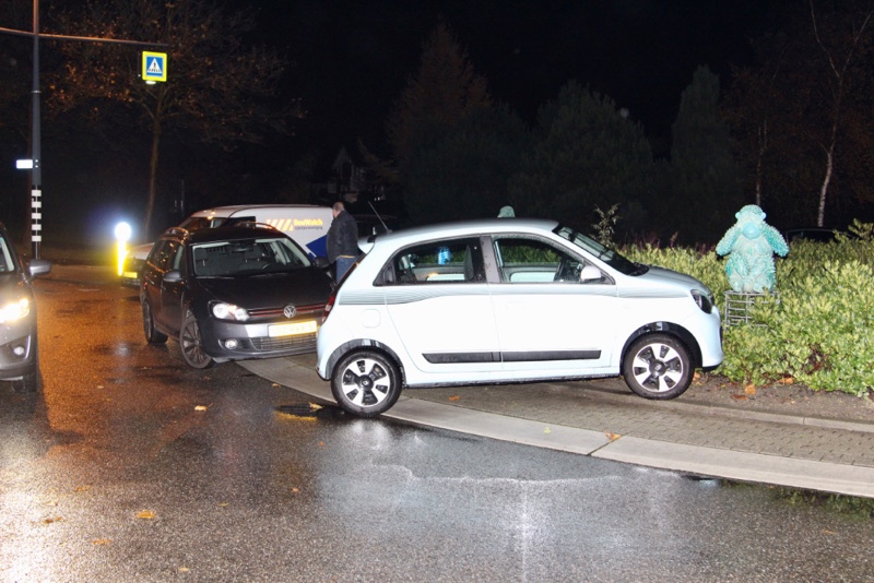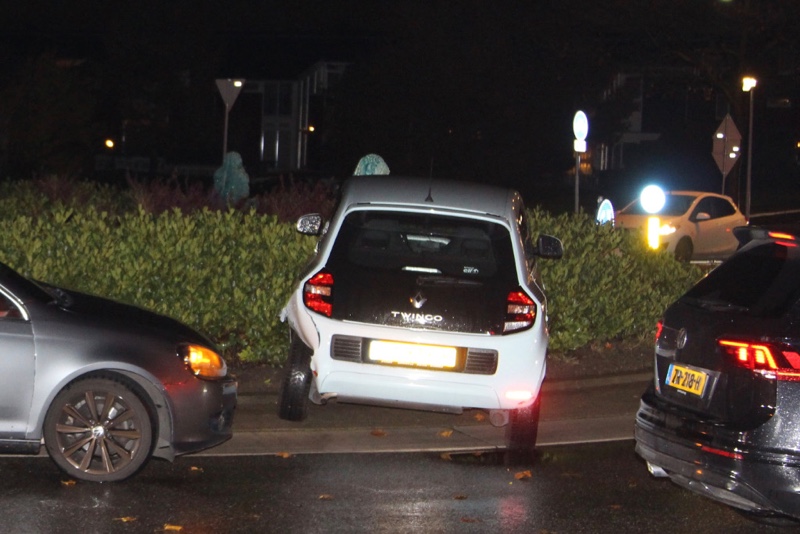 Een van de voertuigen werd linksachter geraakt, waarna de auto vol in het plantsoen terecht kwam.