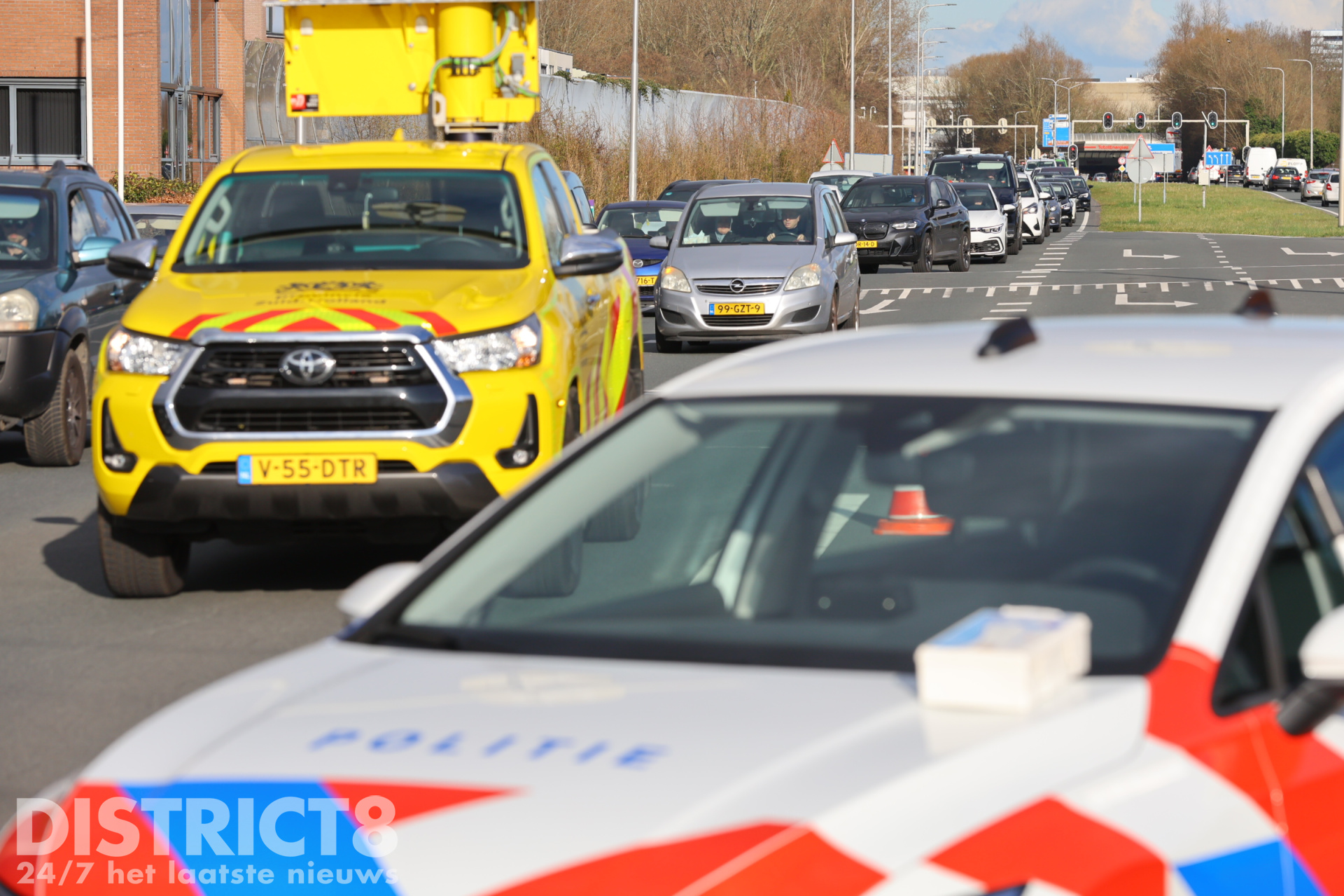 Een ambulance is ter plaatse gekomen om twee betrokkenen te controleren. De hulpdiensten waren snel ter plaatse om de situatie te verhelpen en het verkeer te regelen.
