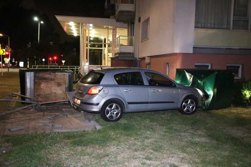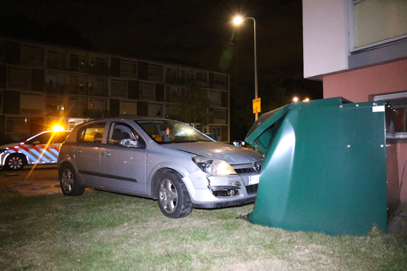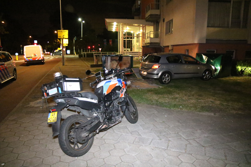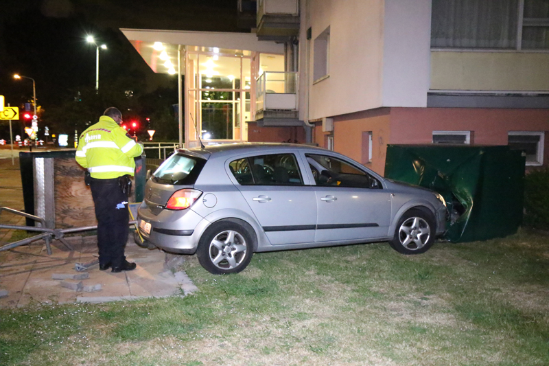 Op het trottoir knalde de auto tegen een scootmobielberging aan. Door de flinke snelheid kwam de auto, met de berging nog ervoor, tot stilstand tegen de gevel van een flat.