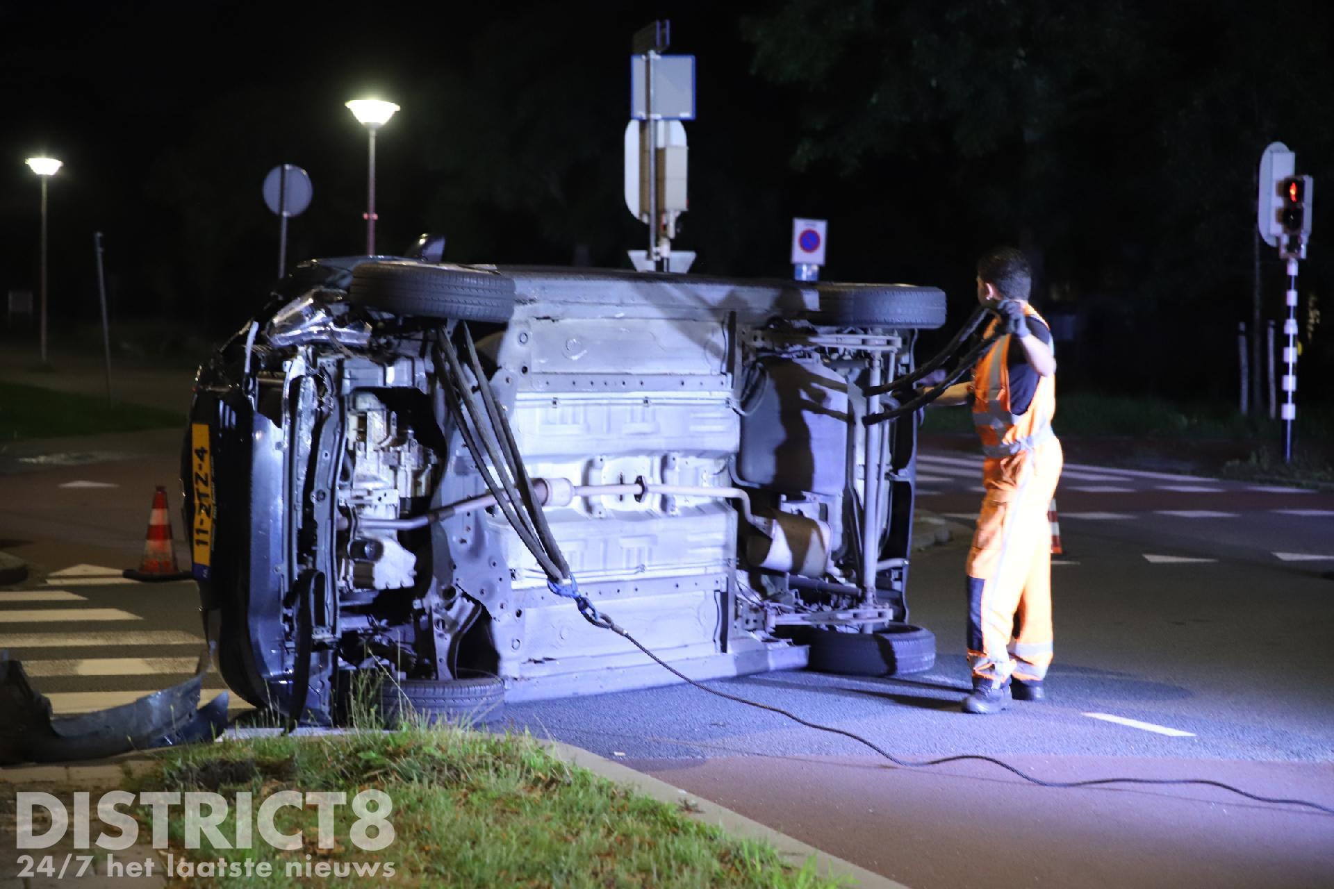 Een alcomobilist is na een éénzijdige aanrijding op zijn kant terecht gekomen en heeft hierbij ook een verkeerslicht geraakt. De opgeroepen brandweerlieden hebben ter plaatse hand- en spandiensten verricht. Het met spoed ter plaatse gekomen ambulancepersoneel heeft de alcomobilist op straat nagekeken, zij hoefde niet mee naar het ziekenhuis.