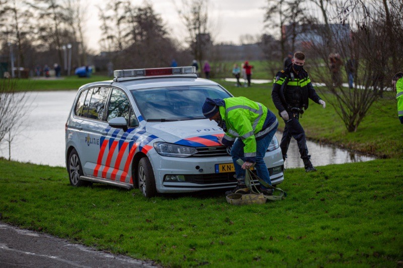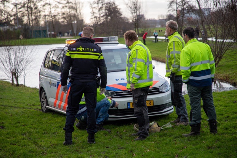 De agent was afgekomen op een melding over een fietser die lelijk gevallen was. Maar nadat de diender zelf weer wilde vertrekken, spinden de wielen, maar bleef de auto op dezelfde plaats staan.