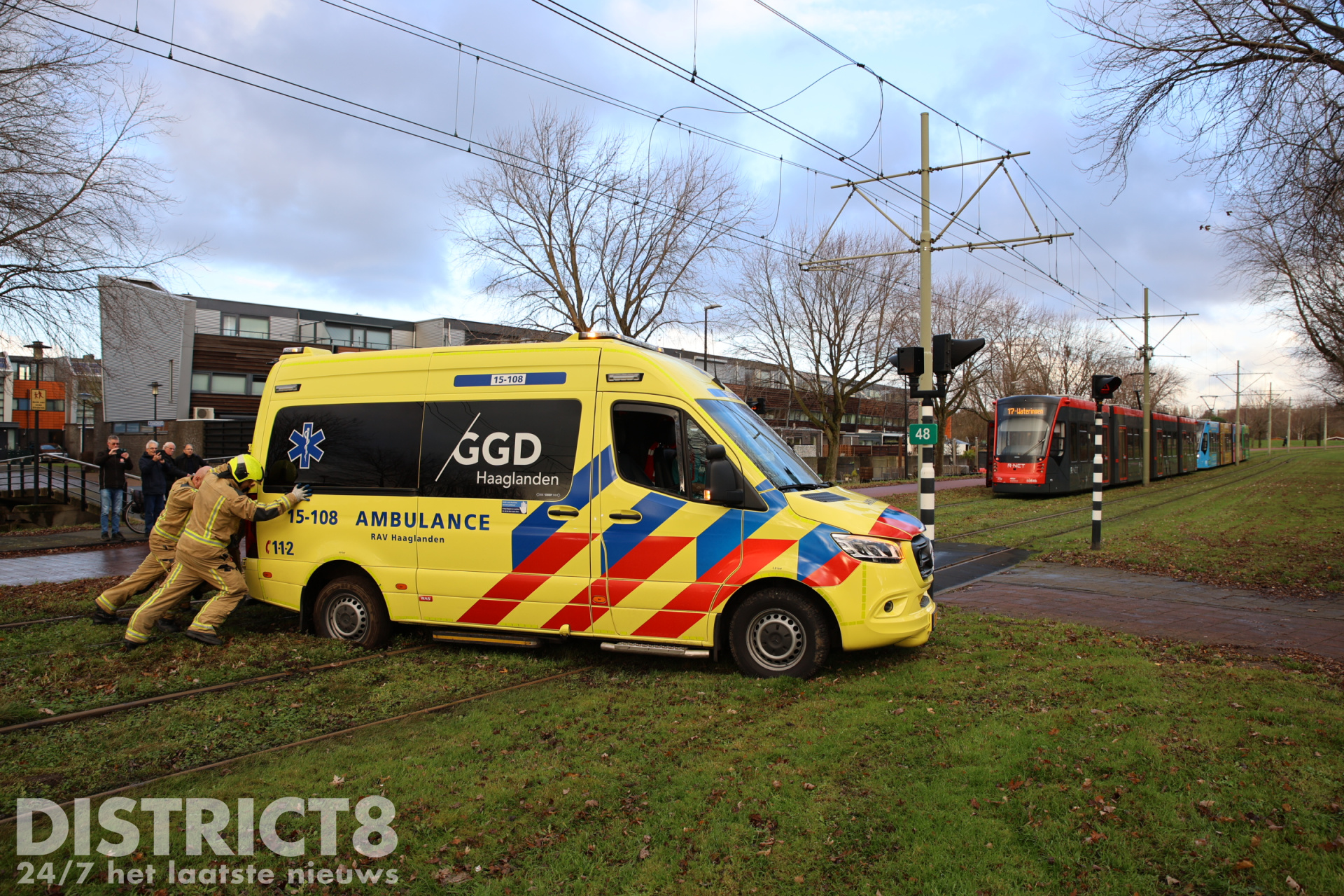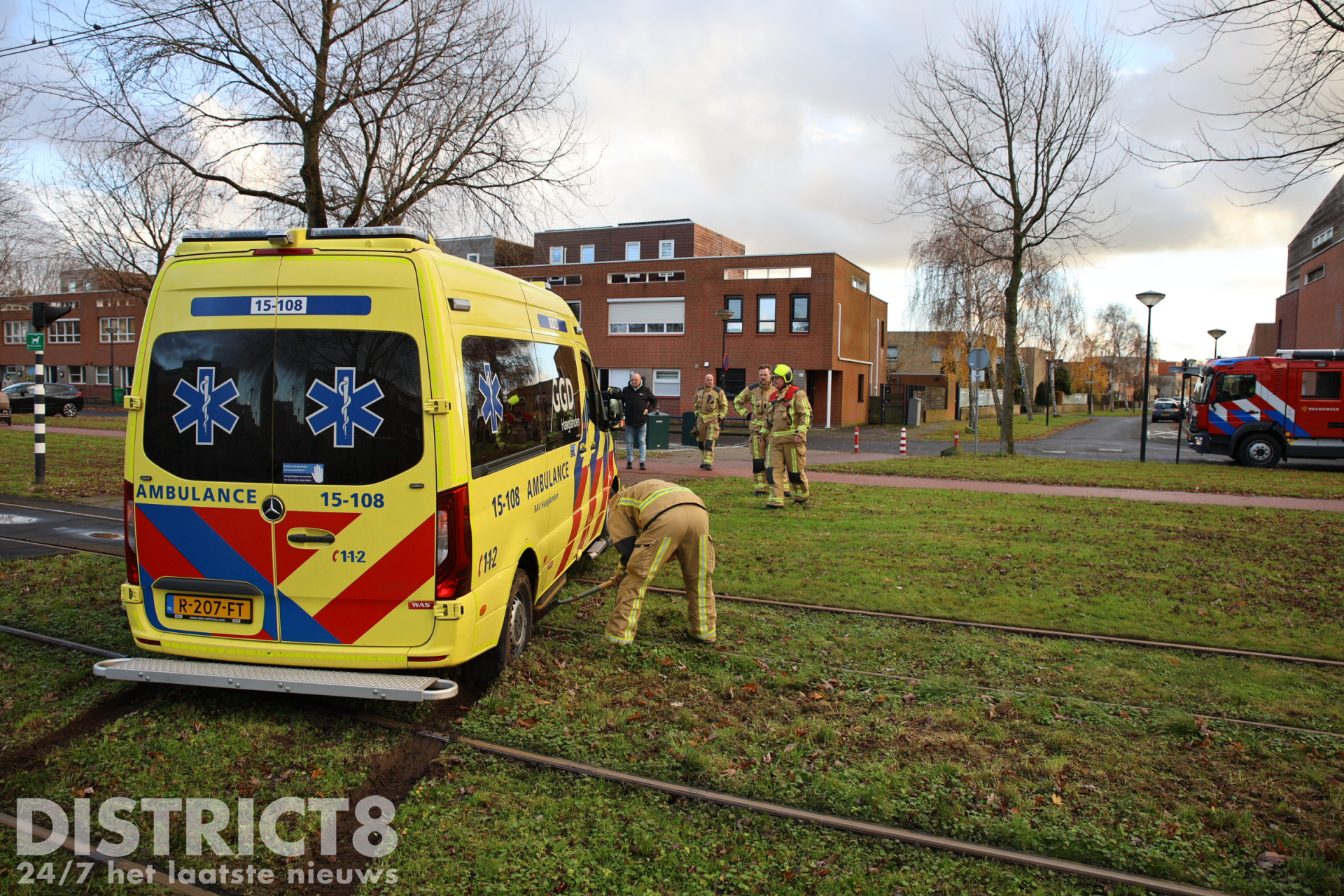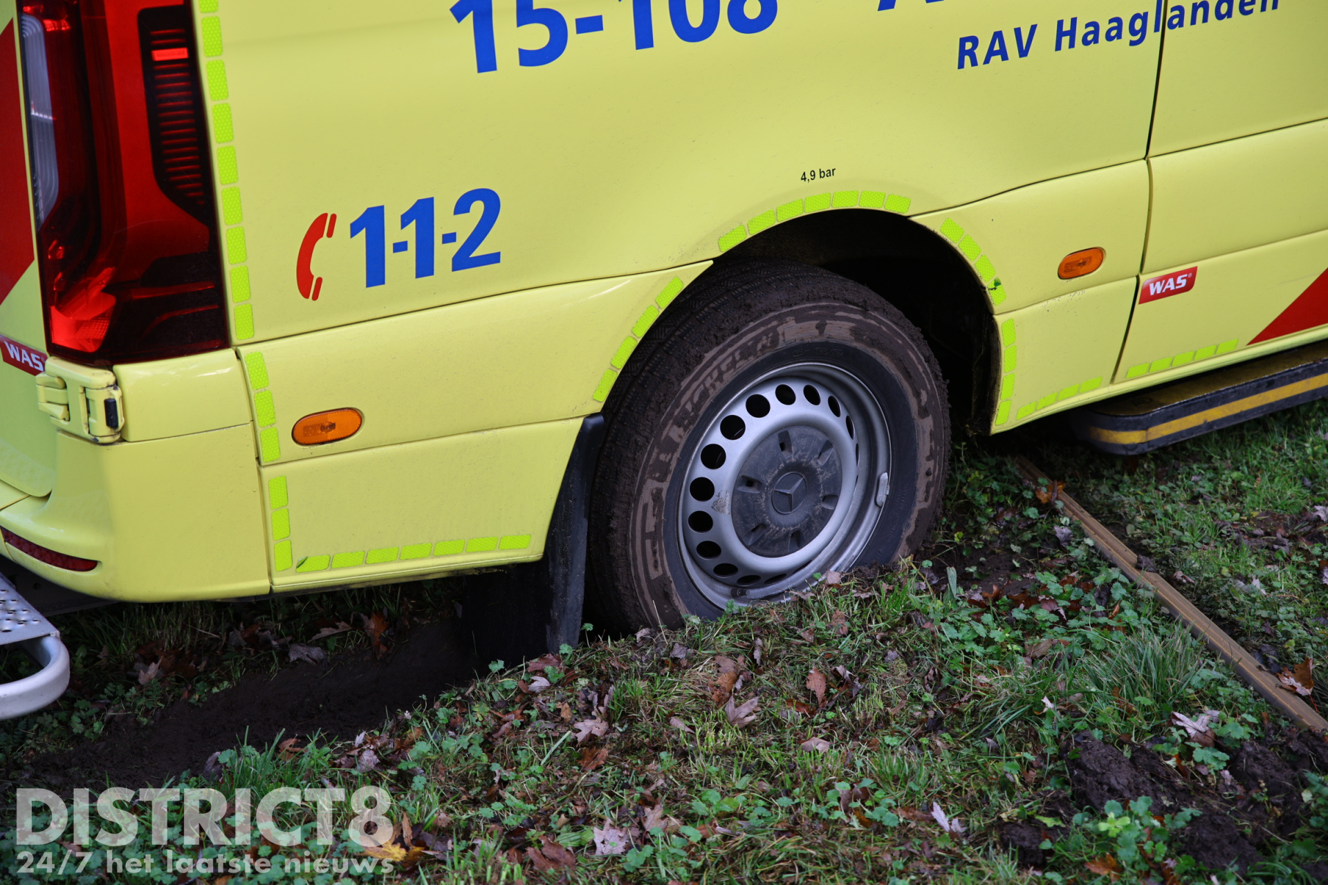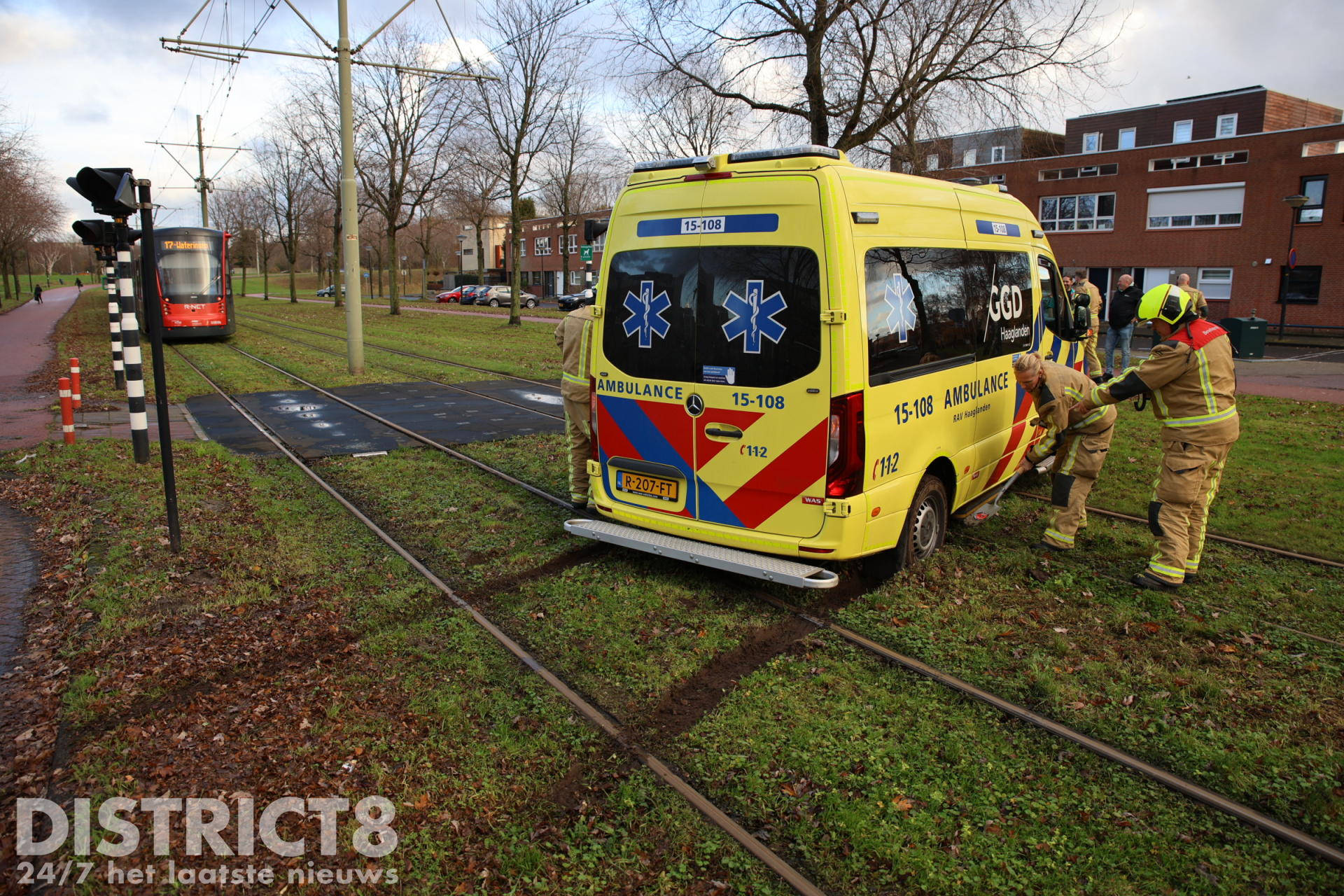 Na een medische noodsituatie was de ambulance vertrokken en wilde deze de tramsporen oversteken. Halverwege zakte de ambulance weg en kwam deze vast te zitten.